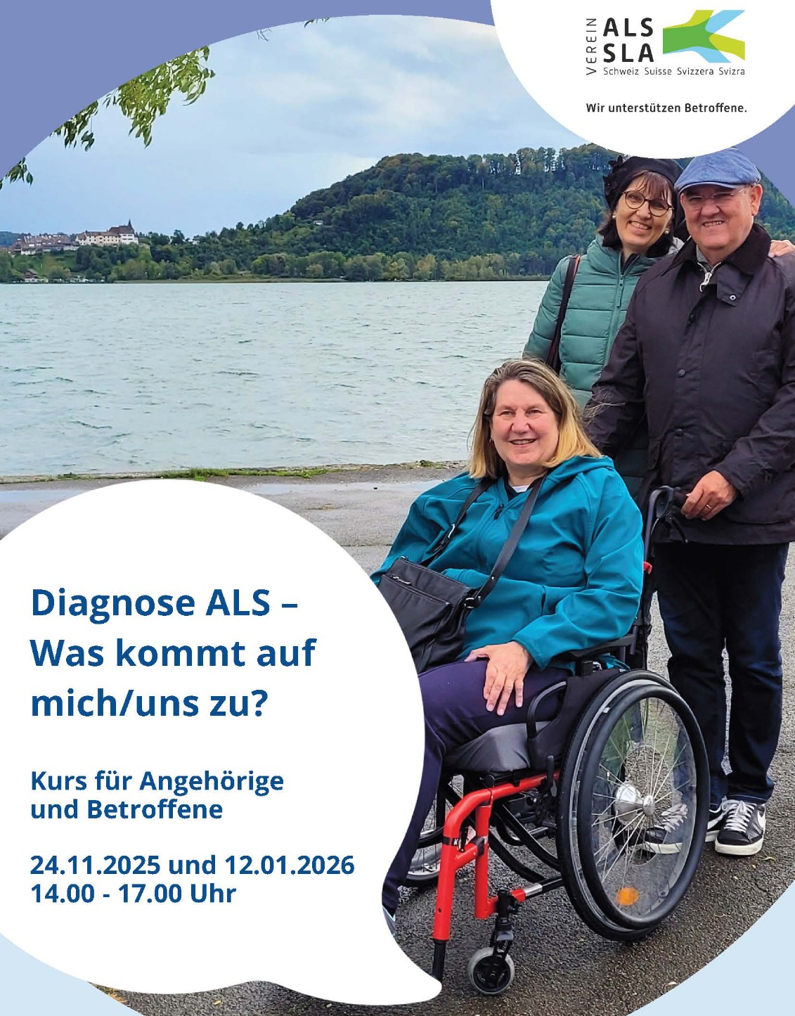 Neu: Schulung für Betroffene & Angehörige Diagnose ALS – Was kommt auf mich/uns zu? Eine ALS-Diagnose wirft viele Fragen auf – bei Betroffenen wie bei Angehörigen. Diese zweiteilige Schulung bietet verständliche Informationen, alltagsnahe Tipps und Raum für Austausch. Teilnehmende werden zudem in verschiedenen Themen geschult, die auf sie zukommen werden. Am 24.11.2025 und 12.01.2026 in St. Gallen. Im Zentrum stehen Ihre Fragen, Ihr Alltag, Ihre Erfahrungen. Anmeldung & weitere Infos