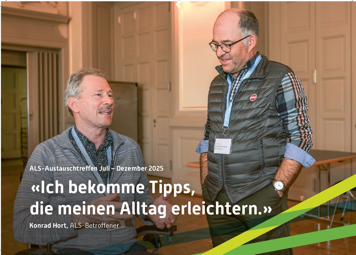 Netzwerktreffen 2025 ALS gehört zu den «seltenen Erkrankungen». In den regionalen Netzwerken werden die vorhandenen Erfahrungen und das bestehende Wissen gebündelt. ALS-Fachgruppe Nordwestschweiz: Dienstag, 14. Oktober 2025, 18 – 21 Uhr, im REHAB Basel zum Thema Hilfsmittel. Referate und Workshops zu folgenden Themen: Sitzen von Patienten mit bulbärer ALS, Kopfhaltung im Sitzen, im Rollstuhl. ALS-Fachgruppe Bern: Dienstag, 18. November 2025, 17 – 19 Uhr Inselspital Bern zum Thema Atemproblematik bei ALS: Nichtinvasive Beatmungsmöglichkeiten, Einsatz von Cough assist und physiotherapeutische Massnahmen. Mehr Informationen und Anmeldung